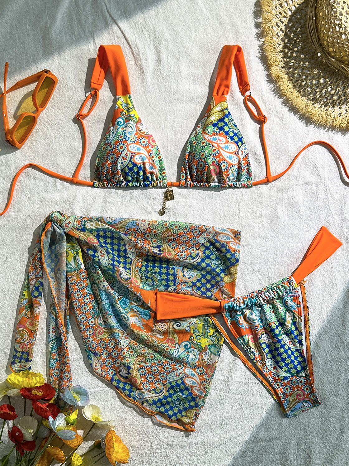 ZASUWA Female Sexy Flowers Print Contrast Color Mesh 3-Pieces Bikini Set